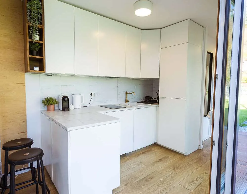 La façade gris clair et le mur du jardin vivant rendent cette petite maison élégante et unique. Les immenses fenêtres laissent entrer beaucoup de lumière naturelleC’est l’option idéale pour une maison de vacances ou une maison d’hôtes.